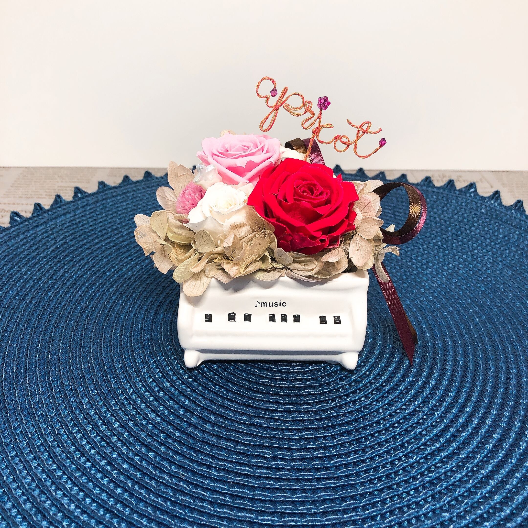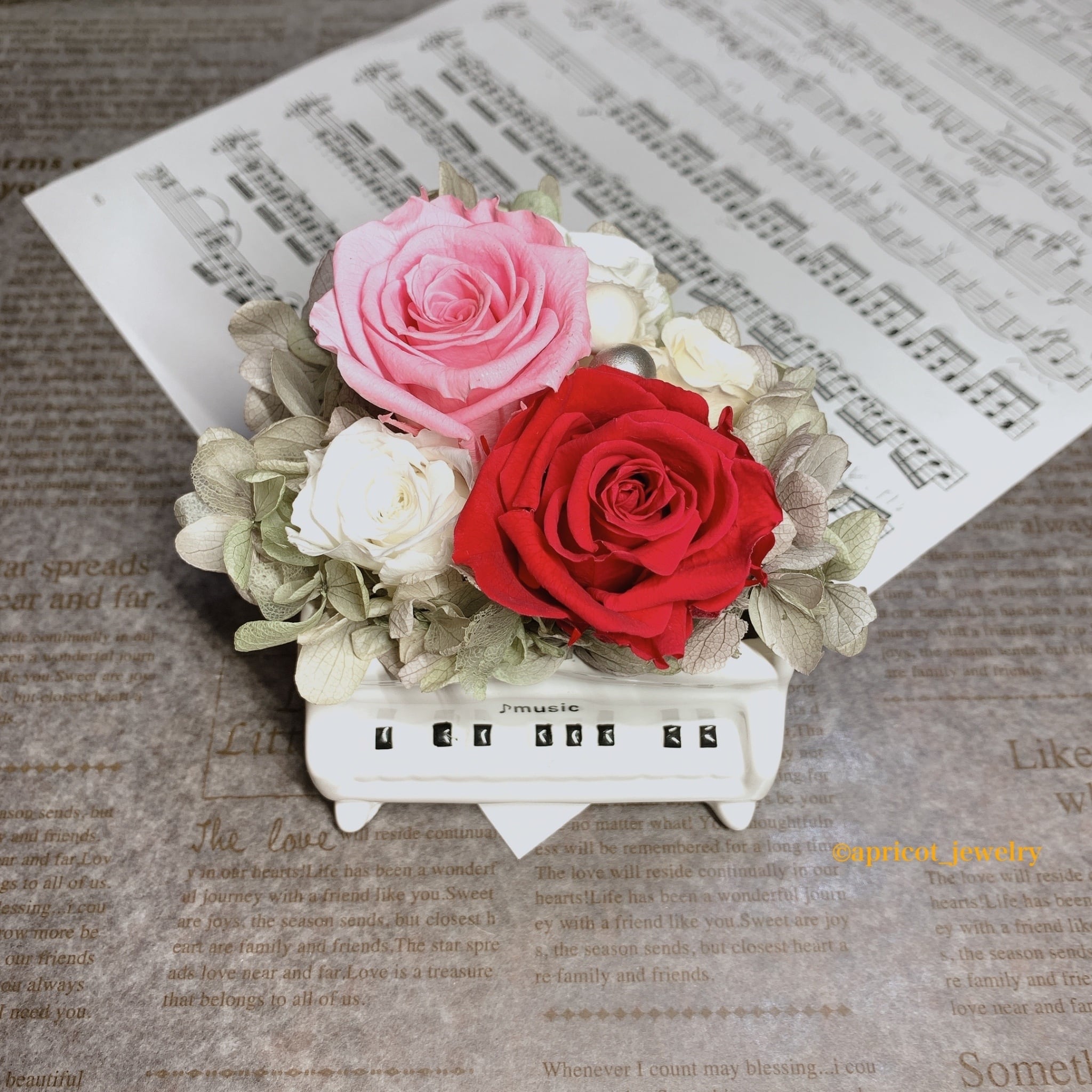 ✤素材:白いピアノ陶器、バラ5輪(中2輪・小3輪)、あじさい、パールピック