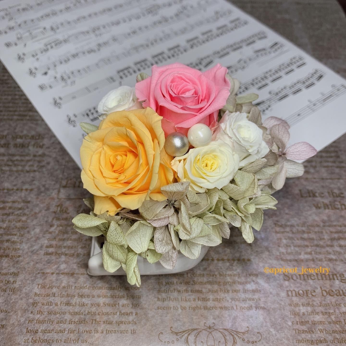 ✤素材:白いピアノ陶器、バラ5輪(中2輪・小3輪)、あじさい、パールピック