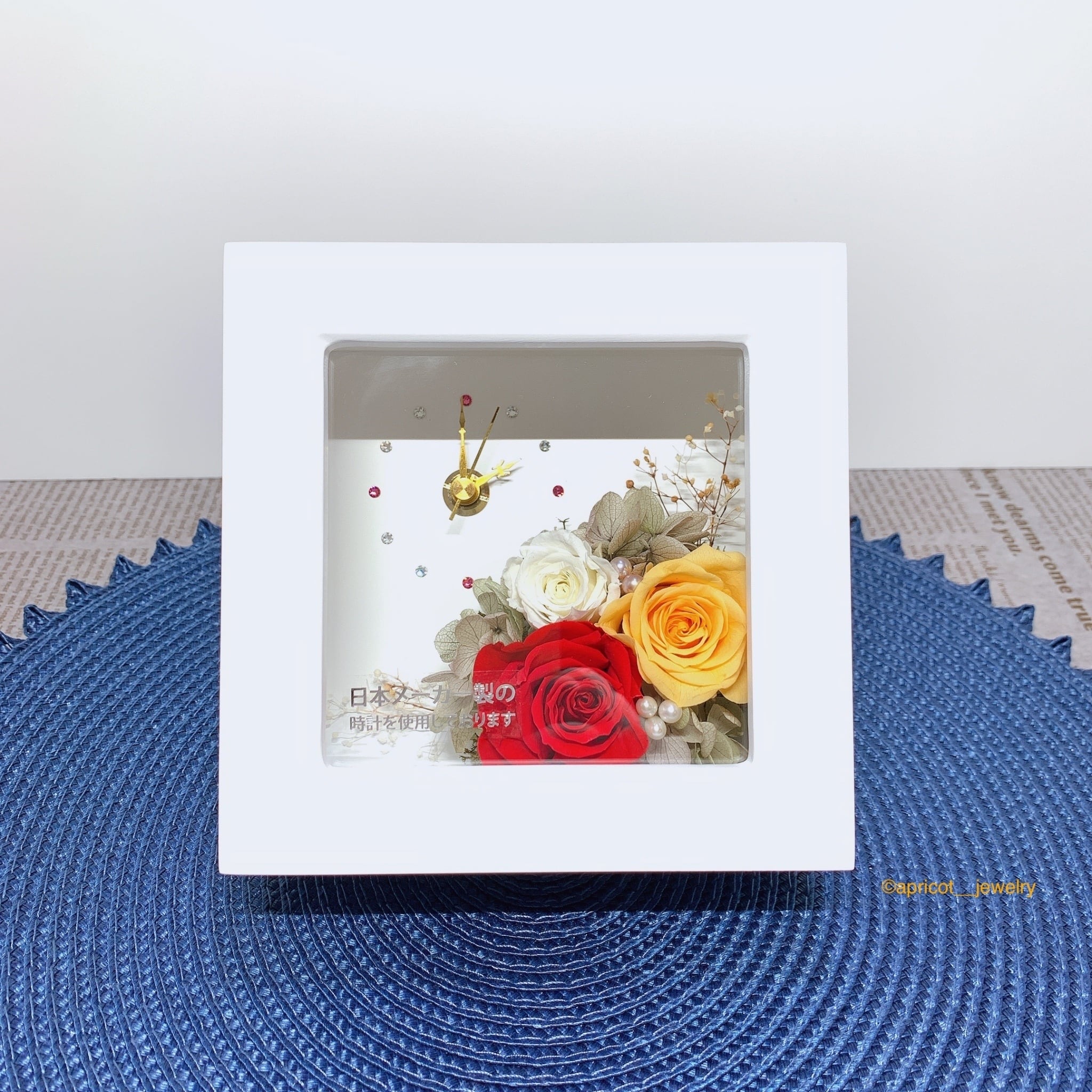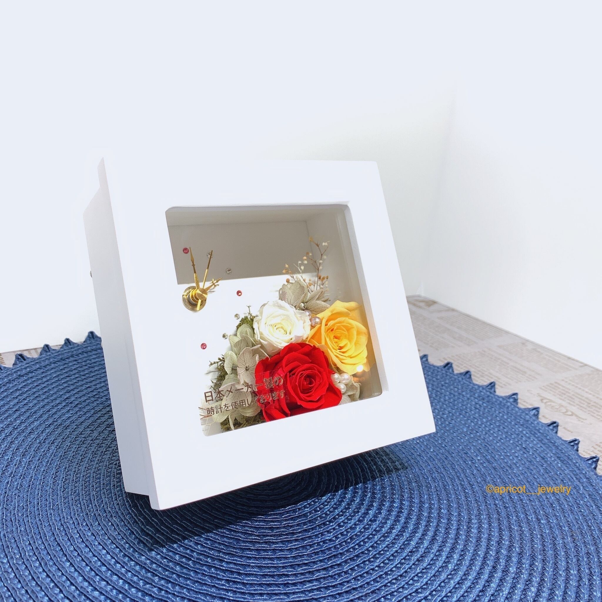 ✤素材:白い箱時計、バラ3輪(中2輪・小1輪)、あじさい、かすみ草、淡水真珠